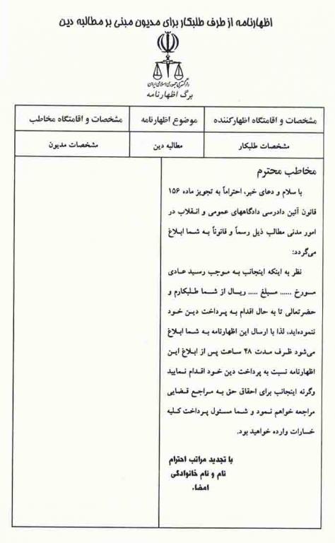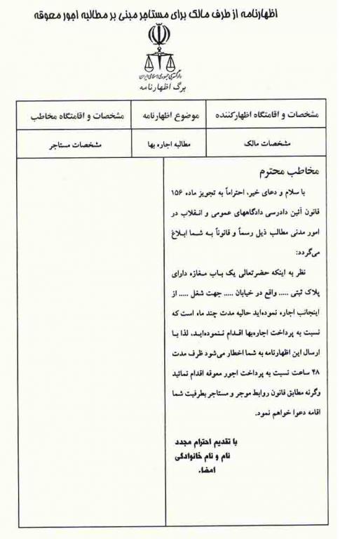 اظهارنامه از طرف مالک برای مستاجر مبنی بر مطالبه ی اجور معوقه
