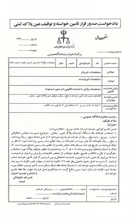 برگه حقوقي دادخواست صدور قرار تامین خواسته و توقیف عین پلاک ثبتی