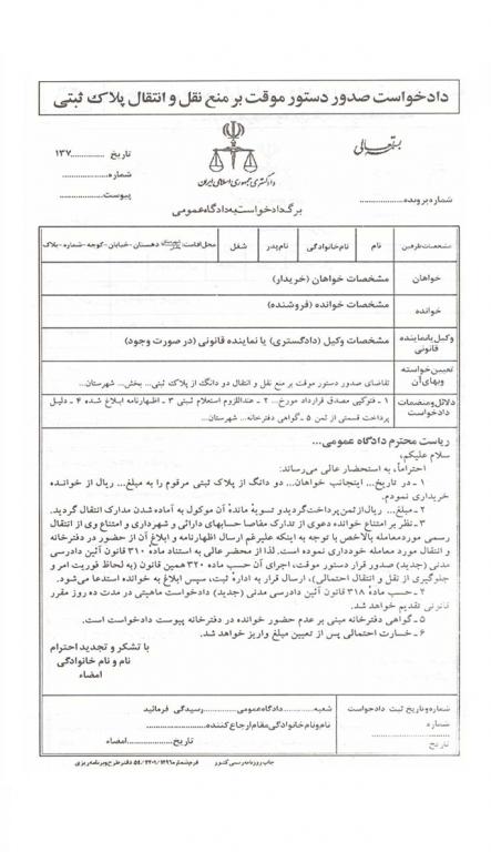 دادخواست صدور دستور موقت بر منع نقل و انتقال پلاک ثبتی - دادخواست صدور دستور موقت بر منع نقل و انتقال پلاک ثبتی