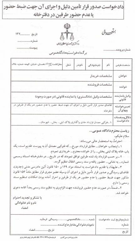 برگه حقوقي دادخواست صدور قرار تامین دلیل و اجرای آن جهت ضبط حضور یا عدم حضور طرفین در دفتر خانه
